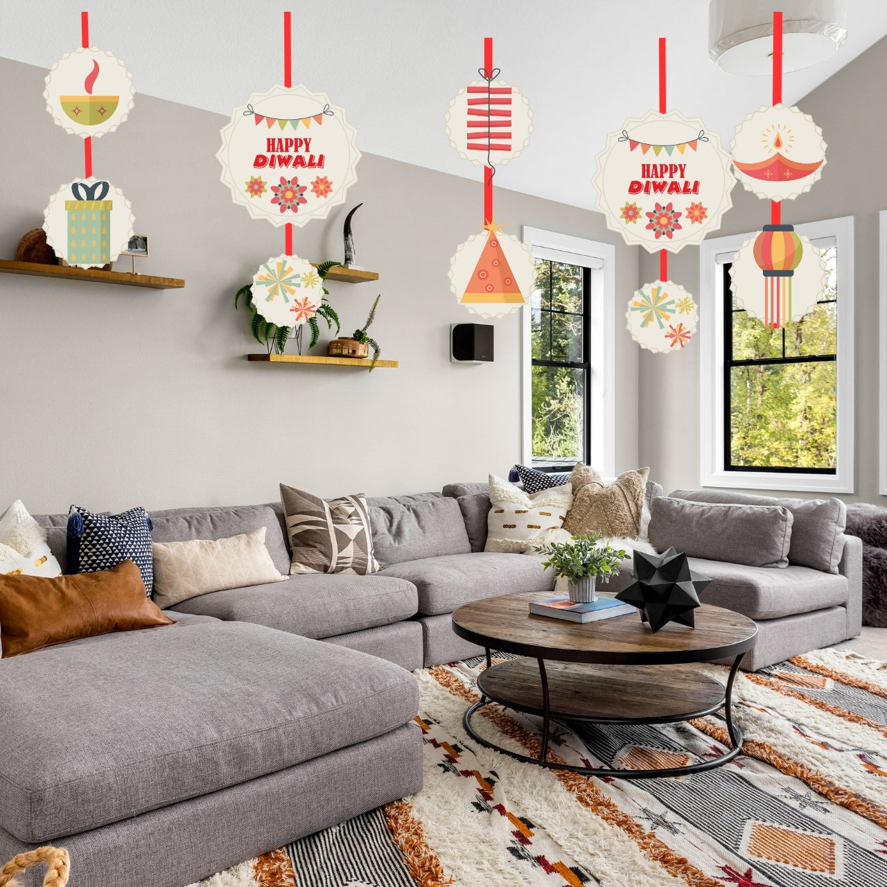 Bring the vibrant spirit of festivals into your home with these delightful hanging decorations. Crafted with intricate designs and vivid colours, these hanging pieces feature traditional Indian diyas and motifs.